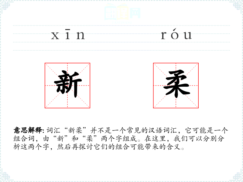 - 在英语中,“新”可以对应为“new”,“柔”可以对应为“soft”或“gentle”。