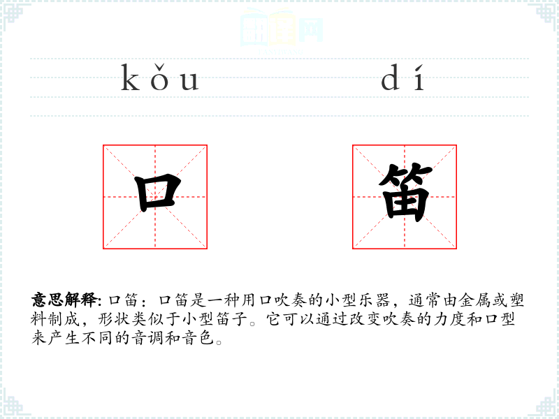 同义词:哨子、口哨 反义词:(由于口笛是一种具体的乐器,反义词不太适用,但可以考虑与大型乐器如钢琴、吉他等相对比)