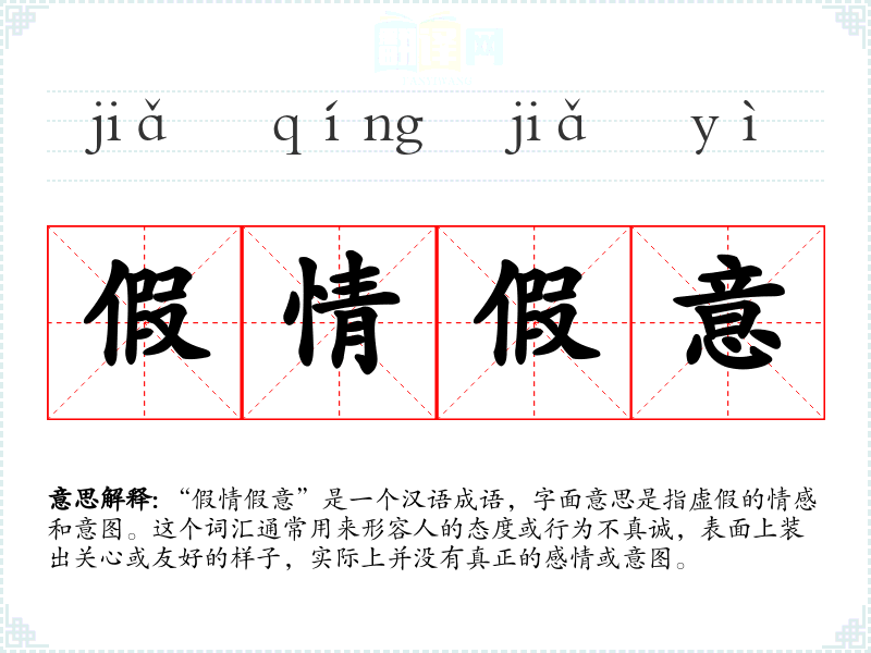“假情假意”是一个汉语成语,字面意思是指虚假的情感和意图。这个词汇通常用来形容人的态度或行为不真诚,表面上装出关心或友好的样子,实际上并没有真正的感情或意图。