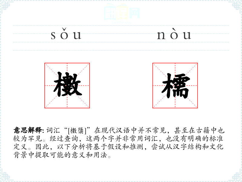 - 櫢:这个字由“木”和“叟”组成,可能与木材或某种木制品有关,但由于缺乏具体文献支持,其确切含义不明。