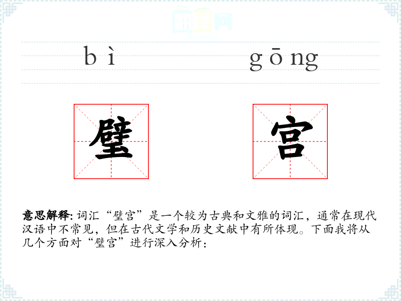 词汇“璧宫”是一个较为古典和文雅的词汇,通常在现代汉语中不常见,但在古代文学和历史文献中有所体现。下面我将从几个方面对“璧宫”进行深入分析: