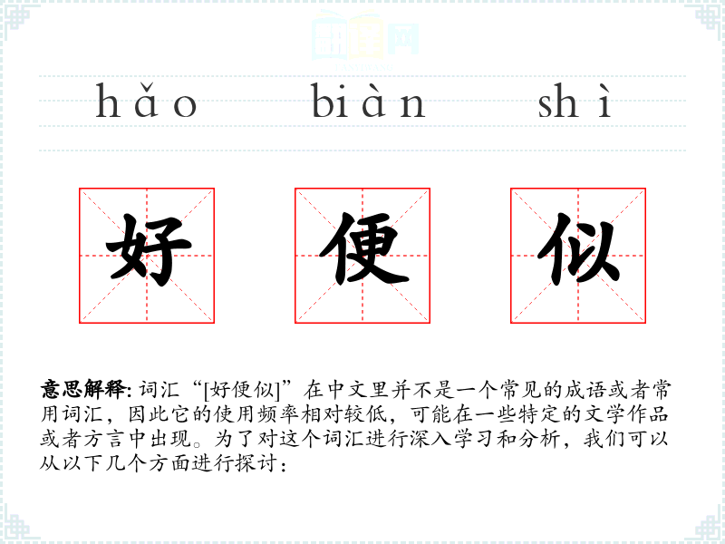 词汇“[好便似]”在中文里并不是一个常见的成语或者常用词汇,因此它的使用频率相对较低,可能在一些特定的文学作品或者方言中出现。为了对这个词汇进行深入学习和分析,我们可以从以下几个方面进行探讨: