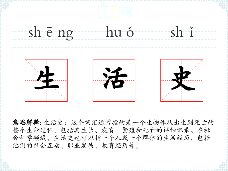 生活史:这个词汇通常指的是一个生物体从出生到死亡的整个生命过程,包括其生长、发育、繁殖和死亡的详细记录。在社会科学领域,生活史也可以指一个人或一个群体的生活经历,包括他们的社会互动、职业发展、教育经历等。
