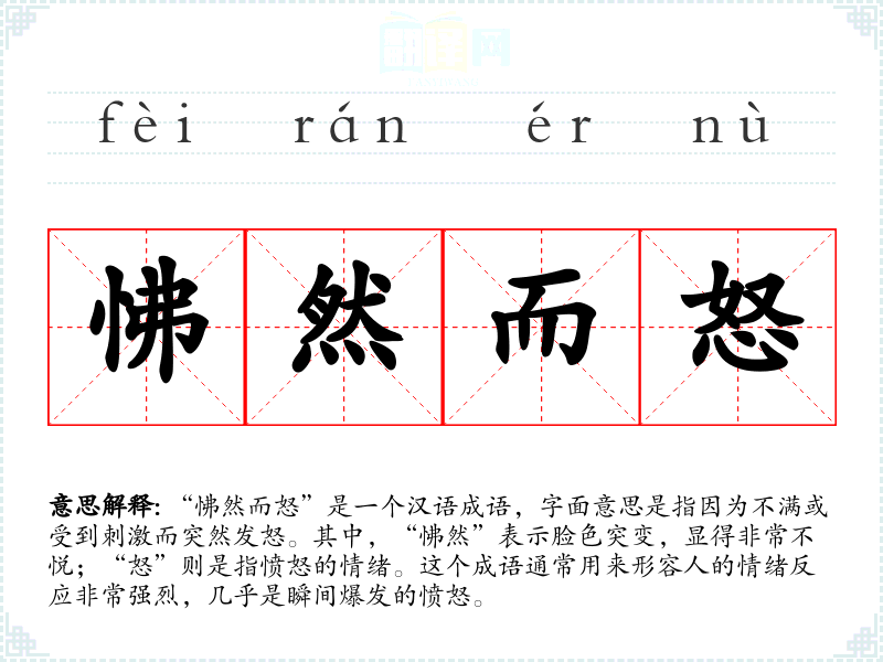 - 细微差别:这些同义词都强调了愤怒的强烈和突然,但“怫然而怒”更侧重于情绪的瞬间爆发和面部表情的变化。