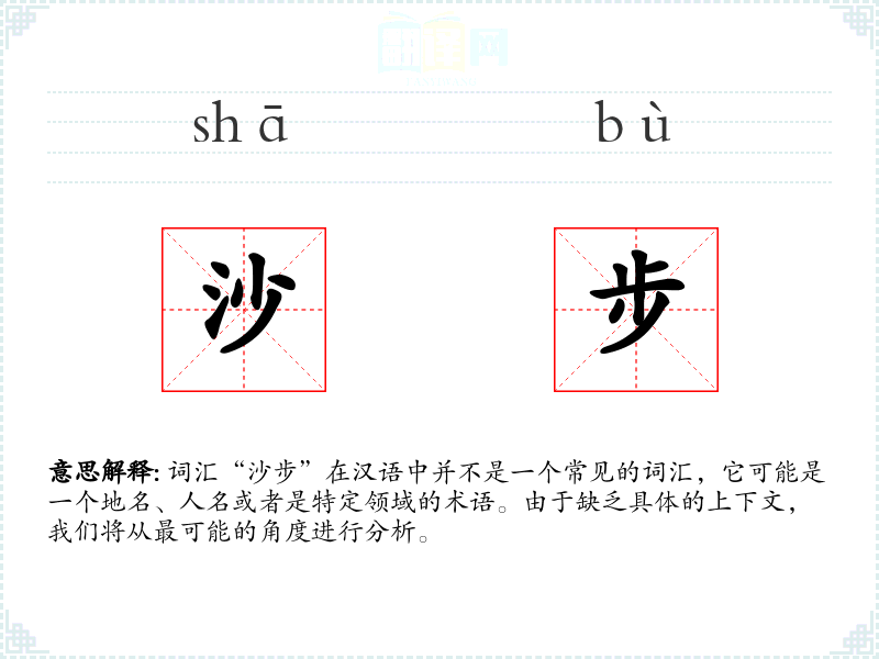 词汇“沙步”在汉语中并不是一个常见的词汇,它可能是一个地名、人名或者是特定领域的术语。由于缺乏具体的上下文,我们将从最可能的角度进行分析。