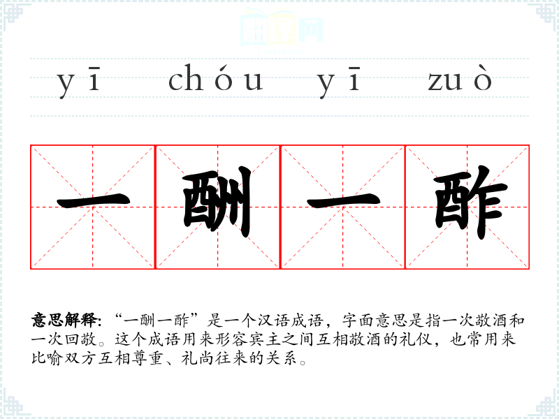 “一酬一酢”是一个汉语成语,字面意思是指一次敬酒和一次回敬。这个成语用来形容宾主之间互相敬酒的礼仪,也常用来比喻双方互相尊重、礼尚往来的关系。