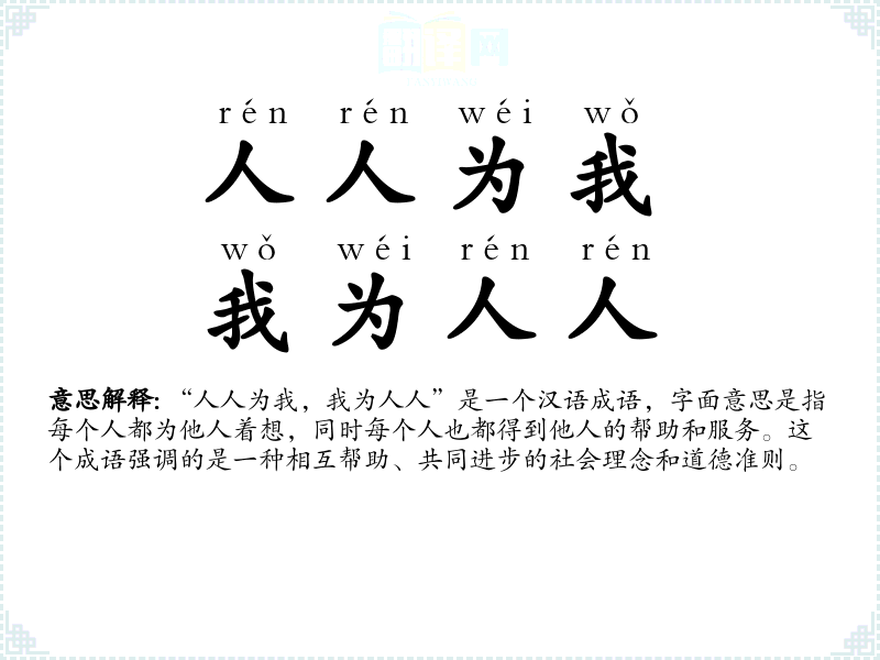 “人人为我,我为人人”是一个汉语成语,字面意思是指每个人都为他人着想,同时每个人也都得到他人的帮助和服务。这个成语强调的是一种相互帮助、共同进步的社会理念和道德准则。