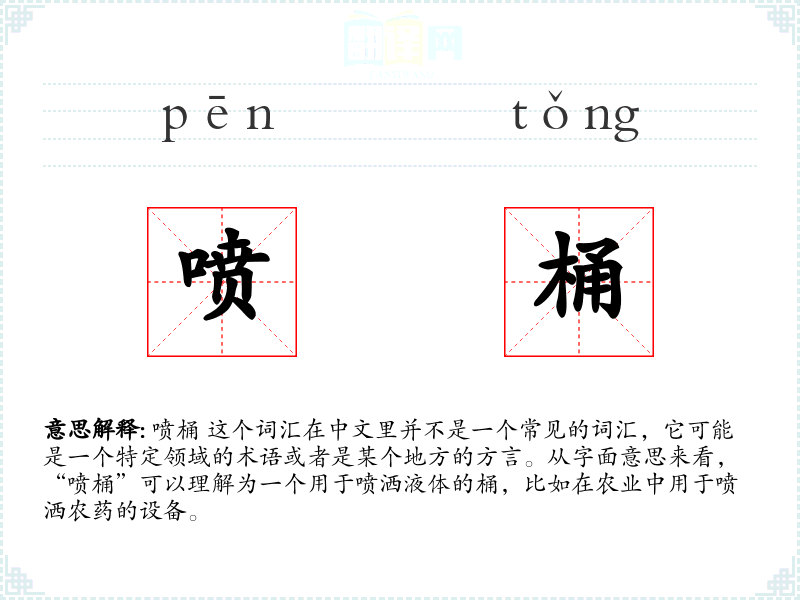 由于“喷桶”不是一个标准词汇,它的词源和演变不太明确。可能是由“喷”和“桶”两个字组合而成,用来描述一种具有喷洒功能的桶状工具。