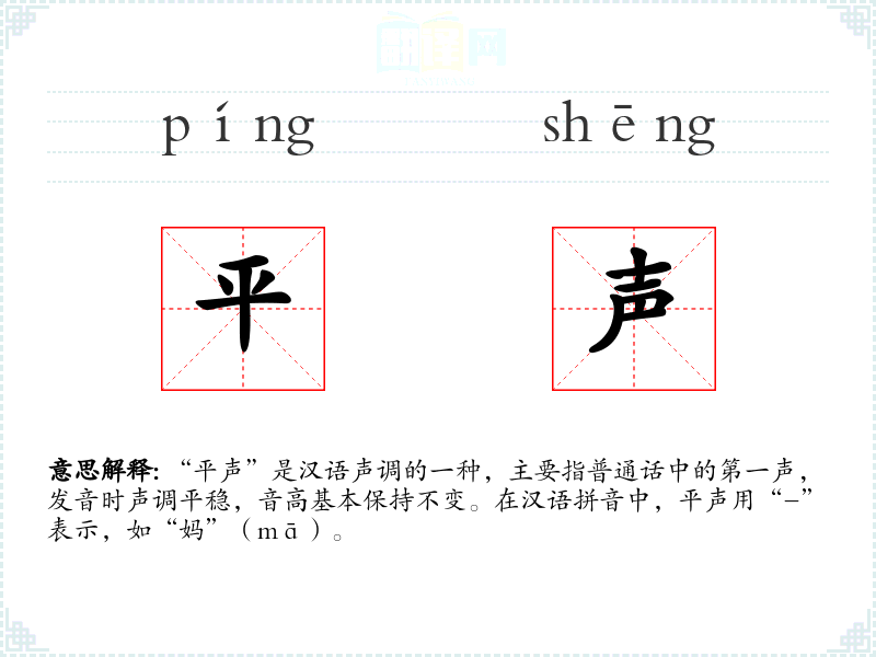 “平声”是汉语声调的一种,主要指普通话中的第一声,发音时声调平稳,音高基本保持不变。在汉语拼音中,平声用“-”表示,如“妈”(mā)。