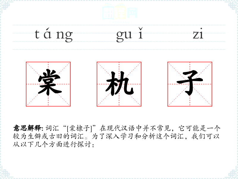 词汇“[棠棣子]”在现代汉语中并不常见,它可能是一个较为生僻或古旧的词汇。为了深入学习和分析这个词汇,我们可以从以下几个方面进行探讨: