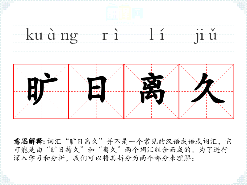 词汇“旷日离久”并不是一个常见的汉语成语或词汇,它可能是由“旷日持久”和“离久”两个词汇组合而成的。为了进行深入学*和分析,我们可以将其拆分为两个部分来理解: