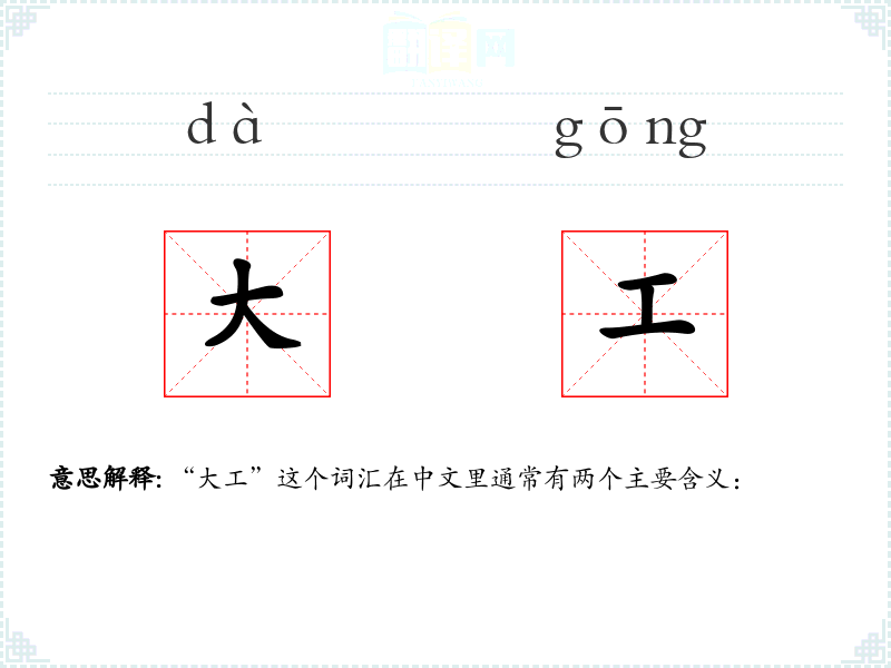 “大工”这个词汇的词源较为直接,由“大”和“工”两个字组成,分别表示“大”的规模或程度和“工”的工作或职业。在历史上,这个词汇主要用于描述那些在手工艺或建筑领域中技艺高超的人。