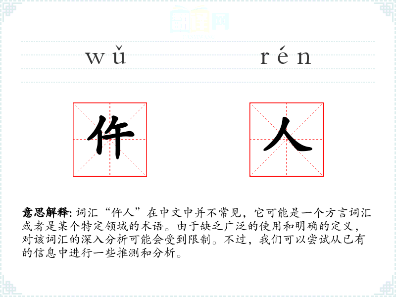词汇“仵人”在中文中并不常见,它可能是一个方言词汇或者是某个特定领域的术语。由于缺乏广泛的使用和明确的定义,对该词汇的深入分析可能会受到限制。不过,我们可以尝试从已有的信息中进行一些推测和分析。