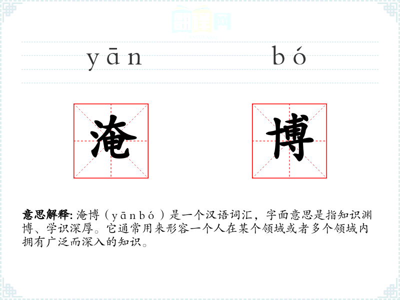淹博(yān bó)是一个汉语词汇,字面意思是指知识渊博、学识深厚。它通常用来形容一个人在某个领域或者多个领域内拥有广泛而深入的知识。
