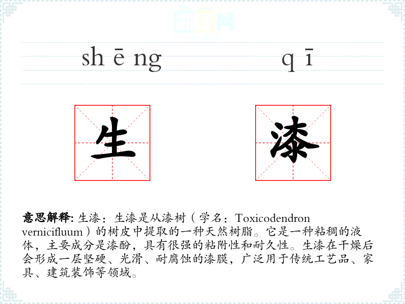 - 反义词:合成漆、化学漆。这些词汇指代的是通过化学合成而非天然提取的漆料,与生漆在成分和性质上有显著差异。