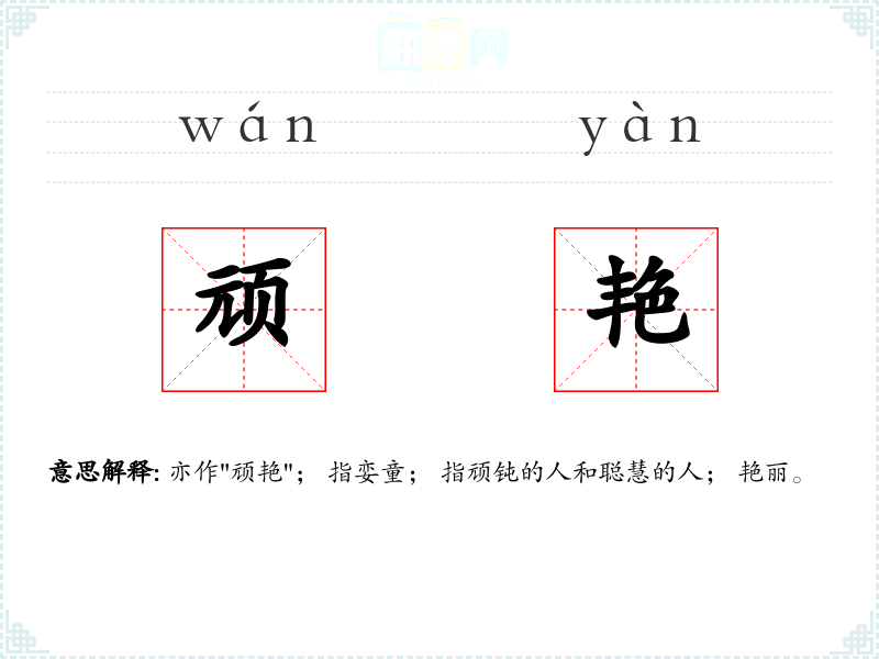 亦作"顽艳"; 指娈童; 指顽钝的人和聪慧的人; 艳丽。
