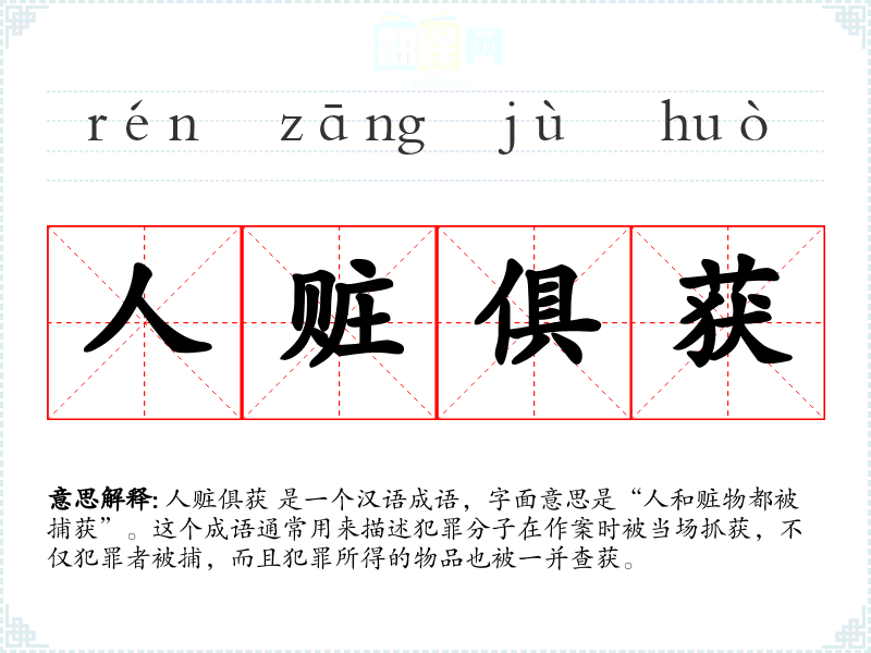 人赃俱获 是一个汉语成语,字面意思是“人和赃物都被捕获”。这个成语通常用来描述犯罪分子在作案时被当场抓获,不仅犯罪者被捕,而且犯罪所得的物品也被一并查获。