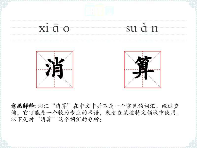 词汇“消算”在中文中并不是一个常见的词汇,经过查询,它可能是一个较为专业的术语,或者在某些特定领域中使用。以下是对“消算”这个词汇的分析: