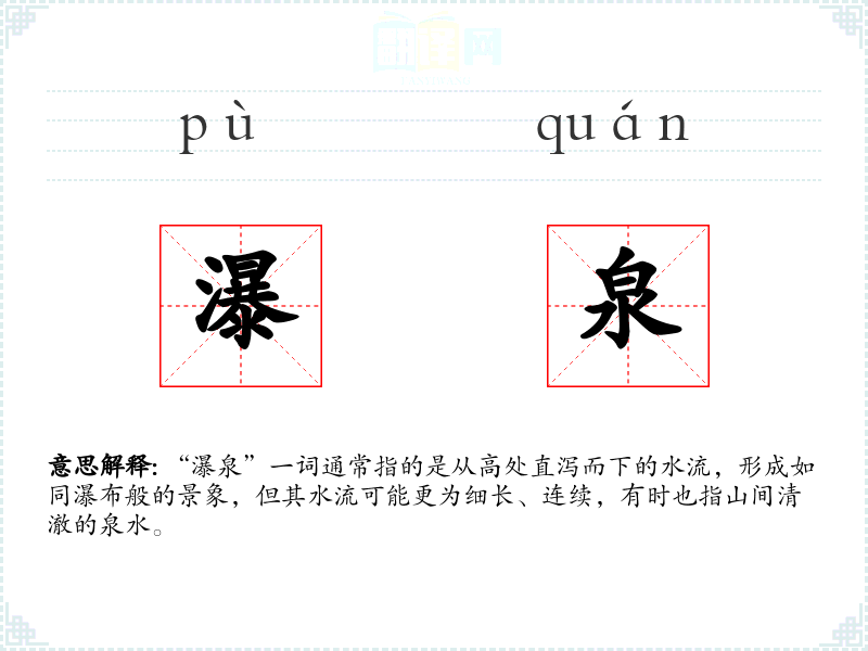 “瀑泉”作为一个描绘自然美景的词汇,不仅丰富了语言的表达,也激发了人们对自然的热爱和向往。在语言学*和表达中,理解和运用这样的词汇能够增强语言的生动性和表现力。