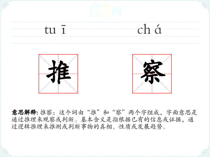 推察:这个词由“推”和“察”两个字组成,字面意思是通过推理来观察或判断。基本含义是指根据已有的信息或证据,通过逻辑推理来推测或判断事物的真相、性质或发展趋势。