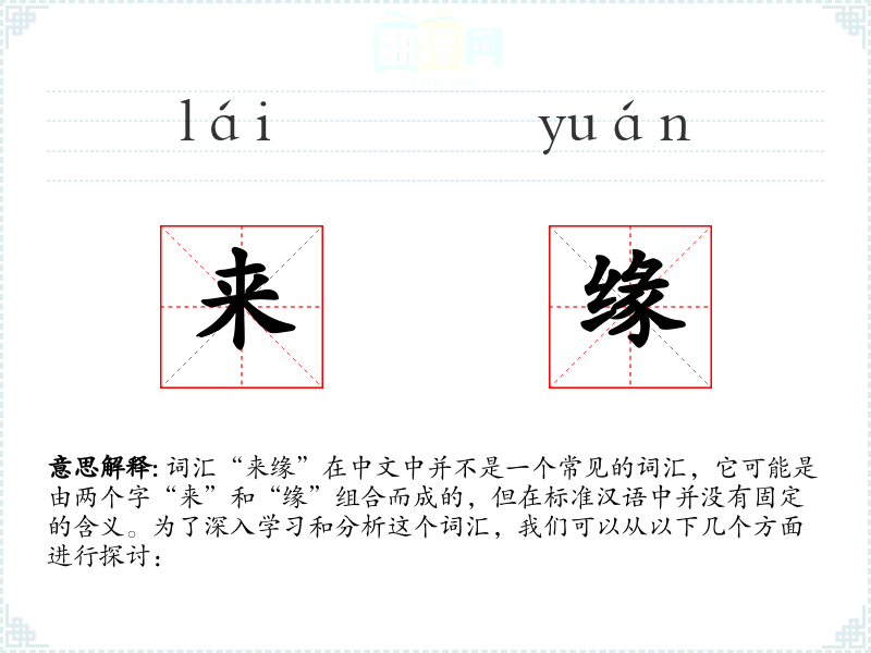 由于“来缘”不是一个标准词汇,我们无法给出一个确切的基本定义。但从字面上理解,“来”通常表示到达或出现的动作,“缘”则常指缘分、关系或原因。因此,“来缘”可能被理解为某种关系的出现或缘分的到来。