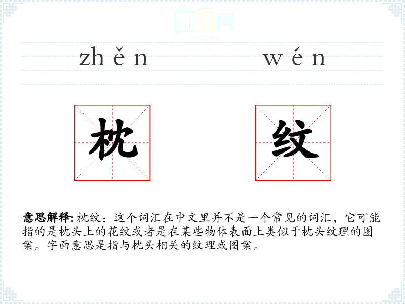 枕纹:这个词汇在中文里并不是一个常见的词汇,它可能指的是枕头上的花纹或者是在某些物体表面上类似于枕头纹理的图案。字面意思是指与枕头相关的纹理或图案。