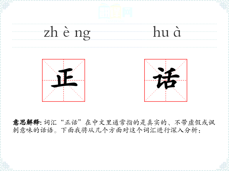 词汇“正话”在中文里通常指的是真实的、不带虚假或讽刺意味的话语。下面我将从几个方面对这个词汇进行深入分析: