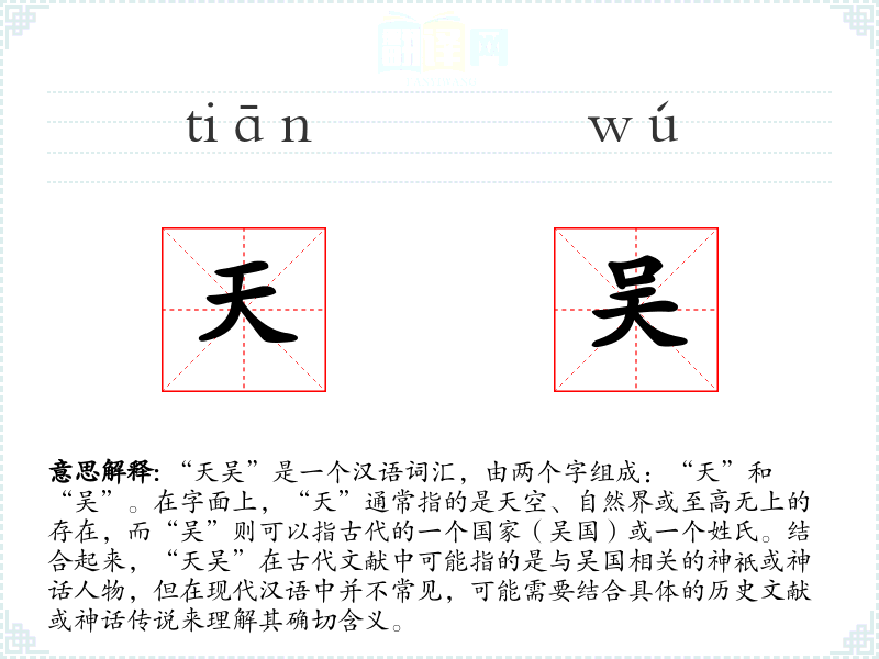 “天吴”是一个汉语词汇,由两个字组成:“天”和“吴”。在字面上,“天”通常指的是天空、自然界或至高无上的存在,而“吴”则可以指古代的一个国家(吴国)或一个姓氏。结合起来,“天吴”在古代文献中可能指的是与吴国相关的神祇或神话人物,但在现代汉语中并不常见,可能需要结合具体的历史文献或神话传说来理解其确切含义。