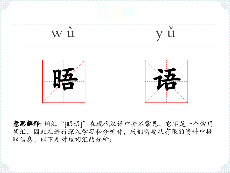 词汇“[晤语]”在现代汉语中并不常见,它不是一个常用词汇,因此在进行深入学习和分析时,我们需要从有限的资料中提取信息。以下是对该词汇的分析: