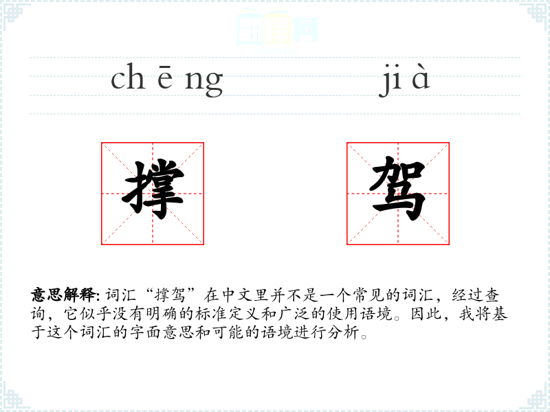 由于“撑驾”不是一个标准词汇,对其的理解和应用可能需要基于假设的语境进行。在语言学习和表达中,了解和掌握标准词汇更为重要。