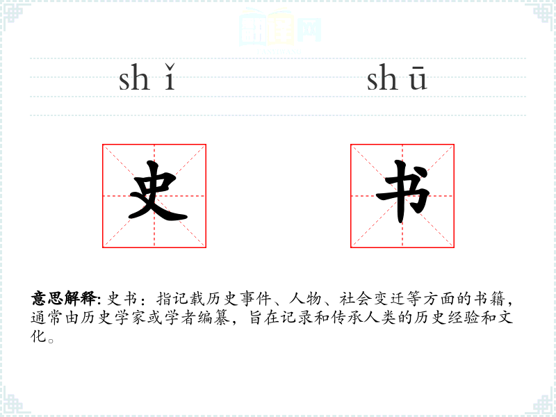 - 词源:“史书”一词由“史”和“书”组成。“史”指历史,“书”指书籍。