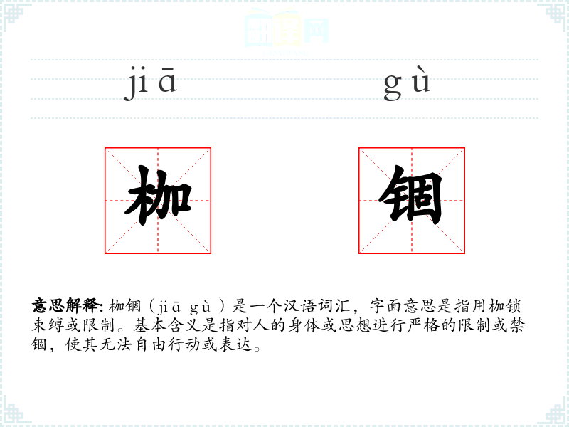枷锢(jiā gù)是一个汉语词汇,字面意思是指用枷锁束缚或限制。基本含义是指对人的身体或思想进行严格的限制或禁锢,使其无法自由行动或表达。