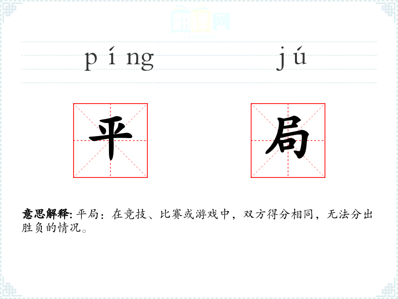 平局一词源于汉语,由“平”和“局”组成。在古代汉语中,“平”有平等、平衡之意,“局”则指局面或局势。随着时间的推移,“平局”逐渐被用来特指比赛中的得分相同的情况。