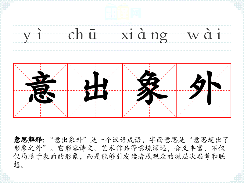 - 专业领域:在艺术评论、文学批评等领域,“意出象外”是一个常用的术语,用来评价作品的艺术价值和思想深度。