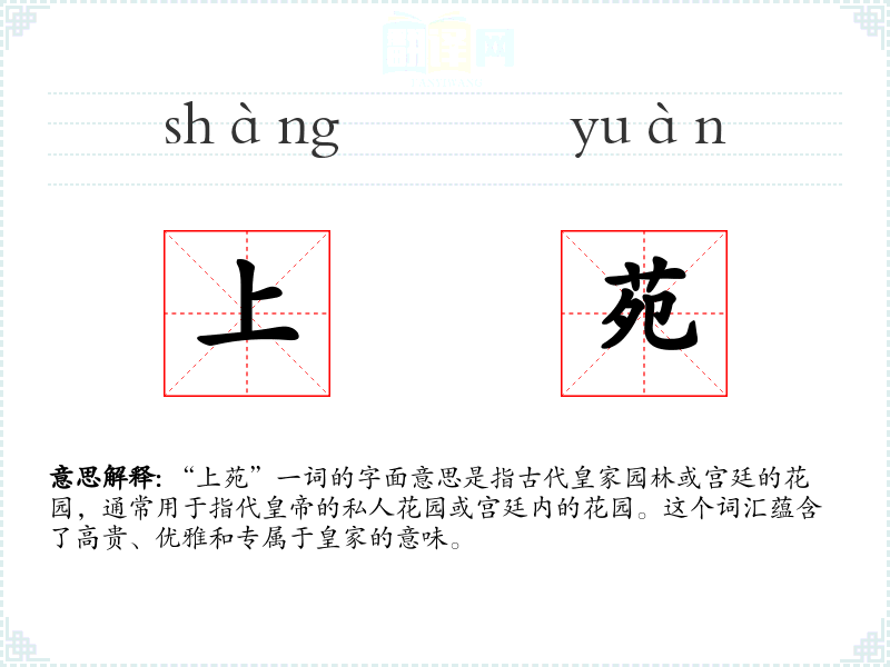 “上苑”一词的字面意思是指古代皇家园林或宫廷的花园,通常用于指代**的私人花园或宫廷内的花园。这个词汇蕴含了高贵、优雅和专属于皇家的意味。