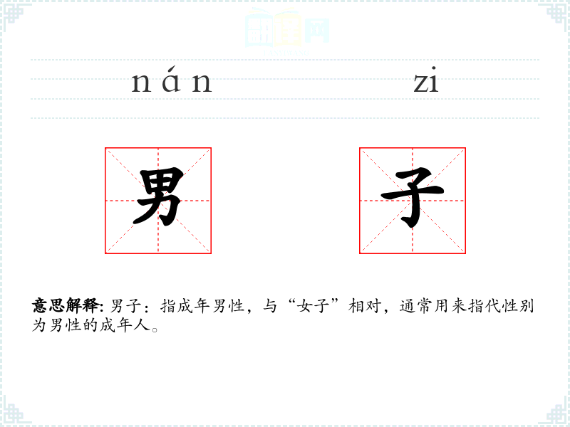 男子:指成年男性,与“女子”相对,通常用来指代性别为男性的成年人。