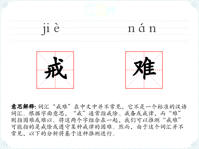 词汇“戒难”在中文中并不常见,它不是一个标准的汉语词汇。根据字面意思,“戒”通常指戒除、戒备或戒律,而“难”则指困难或难以。将这两个字组合在一起,我们可以推测“戒难”可能指的是戒除或遵守某种戒律的困难。然而,由于这个词汇并不常见,以下的分析将基于这种推测进行。