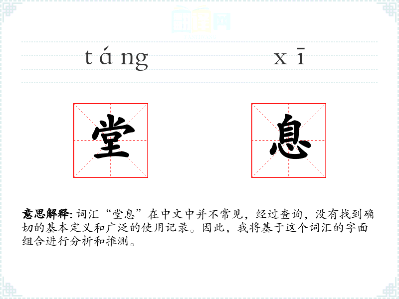 由于“堂息”不是一个常用词汇,它在不同语境下的使用可能非常有限。在文学作品中,如果出现这个词,可能是为了营造一种特定的氛围或表达某种特定的情感。
