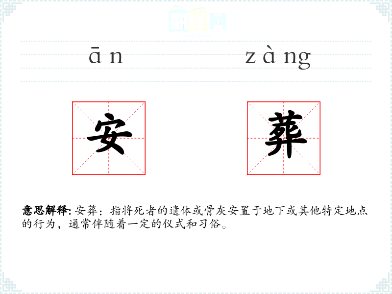 - 词源:安葬一词源自古代汉语,其中“安”意味着安置、平静,“葬”则指埋葬。