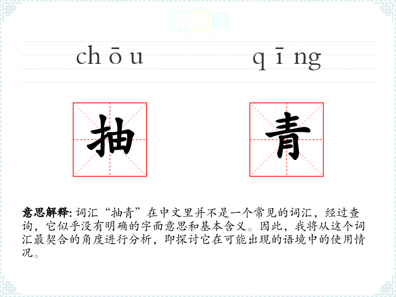 由于“抽青”不是一个标准词汇,我们无法提供一个确切的基本定义。它可能是某个地区方言中的词汇,或者是某个特定行业或社群中的术语。