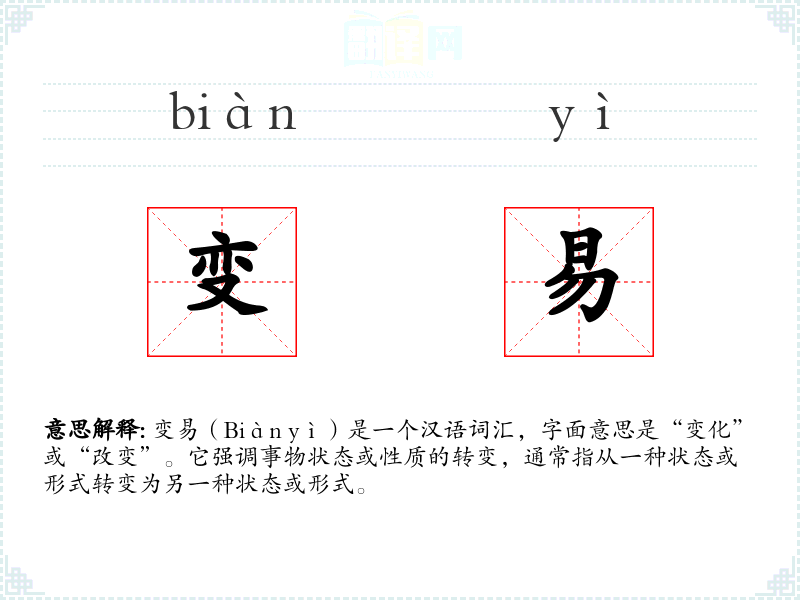 变易(Biàn yì)是一个汉语词汇,字面意思是“变化”或“改变”。它强调事物状态或性质的转变,通常指从一种状态或形式转变为另一种状态或形式。