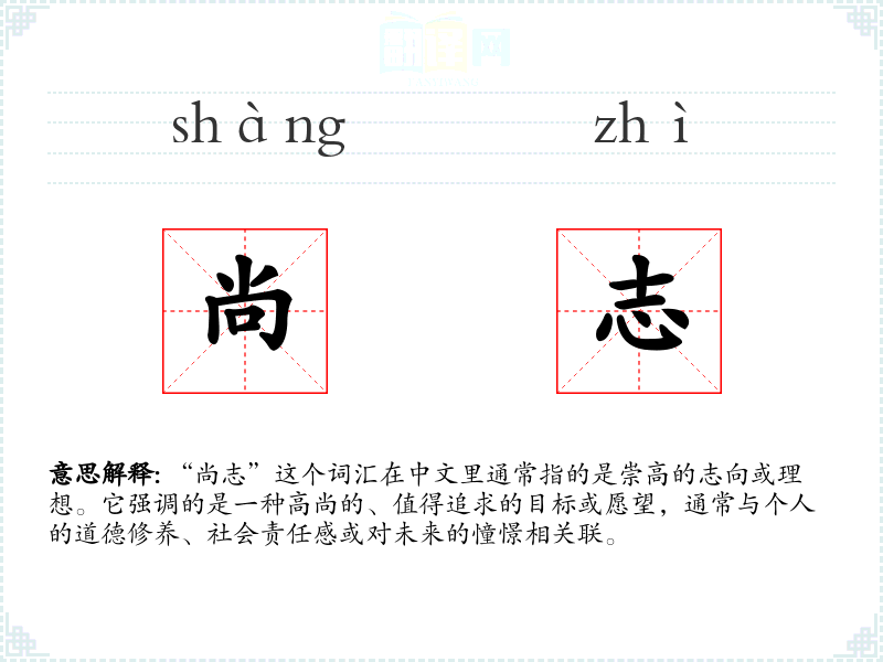 “尚志”这个词汇在中文里通常指的是崇高的志向或理想。它强调的是一种高尚的、值得追求的目标或愿望,通常与个人的道德修养、社会责任感或对未来的憧憬相关联。