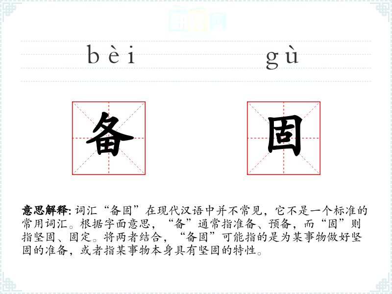 词汇“备固”在现代汉语中并不常见,它不是一个标准的常用词汇。根据字面意思,“备”通常指准备、预备,而“固”则指坚固、固定。将两者结合,“备固”可能指的是为某事物做好坚固的准备,或者指某事物本身具有坚固的特性。
