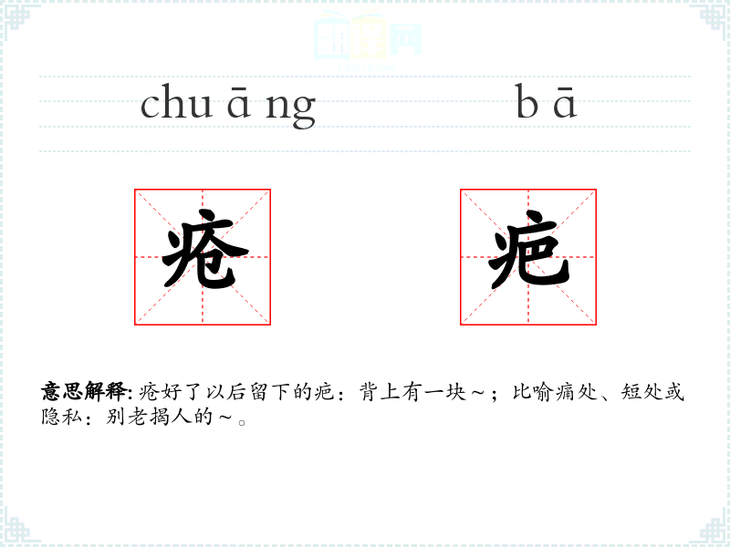 疮好了以后留下的疤:背上有一块~;比喻痛处、短处或隐私:别老揭人的~。