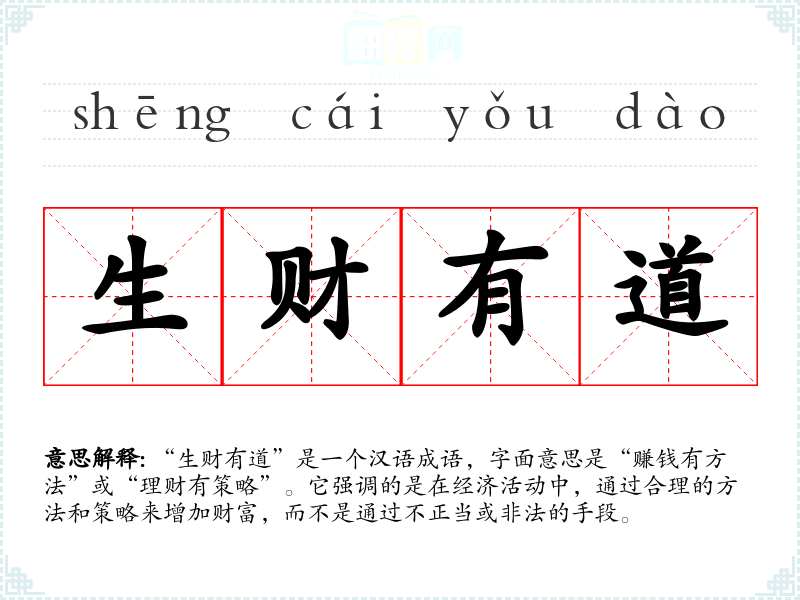 “生财有道”是一个汉语成语,字面意思是“赚钱有方法”或“理财有策略”。它强调的是在经济活动中,通过合理的方法和策略来增加财富,而不是通过不正当或非法的手段。