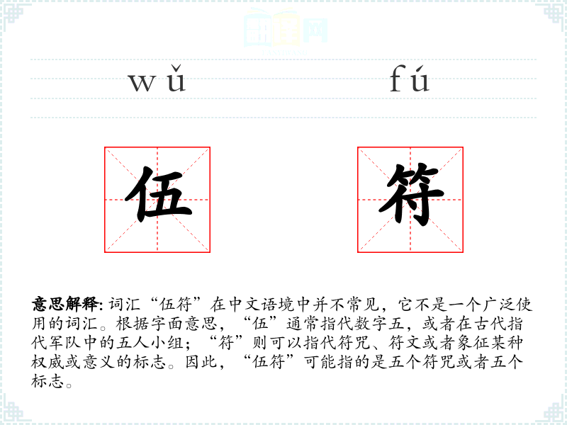 - 词源:“伍”和“符”都是古代汉语词汇,“伍”源自古代军队的编制,“符”则源自古代的符咒和符文。