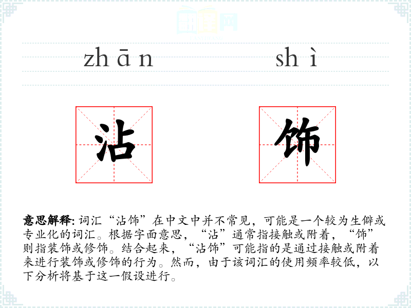 词汇“沾饰”在中文中并不常见,可能是一个较为生僻或专业化的词汇。根据字面意思,“沾”通常指接触或附着,“饰”则指装饰或修饰。结合起来,“沾饰”可能指的是通过接触或附着来进行装饰或修饰的行为。然而,由于该词汇的使用频率较低,以下分析将基于这一假设进行。