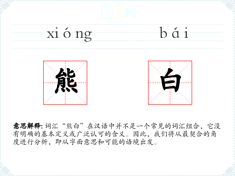 “熊白”作为一个词汇组合,在汉语中没有明确的定义或广泛的使用。它的意义和应用非常有限,主要取决于特定的上下文。在语言学习和表达中,了解这样的词汇组合有助于扩展词汇知识,但在实际使用中可能并不常见。