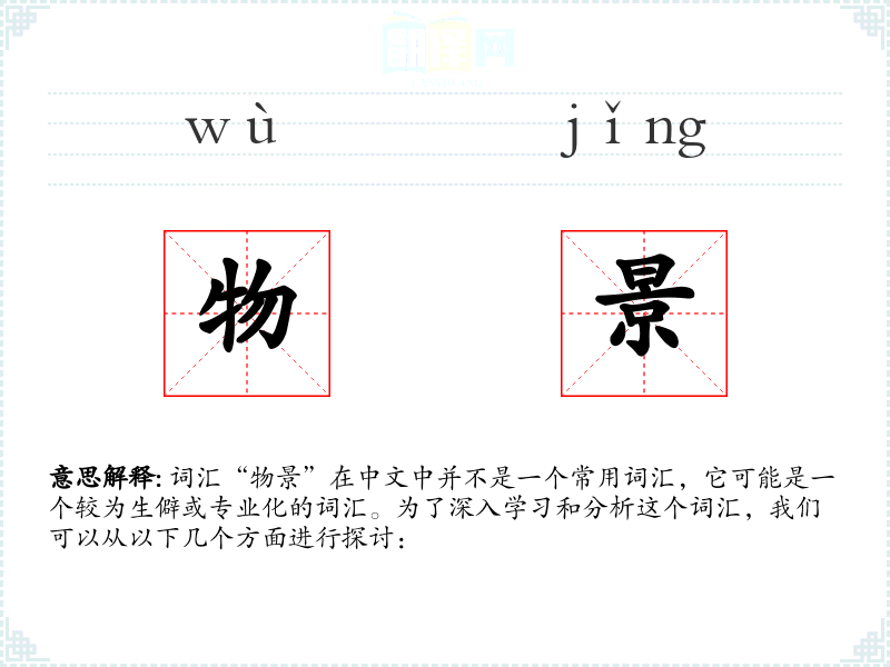 词汇“物景”在中文中并不是一个常用词汇,它可能是一个较为生僻或专业化的词汇。为了深入学习和分析这个词汇,我们可以从以下几个方面进行探讨: