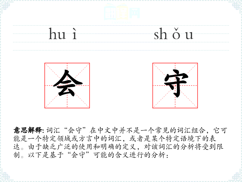 - 由于“会守”不是一个广泛使用的词汇,其词源和演变难以追溯。
